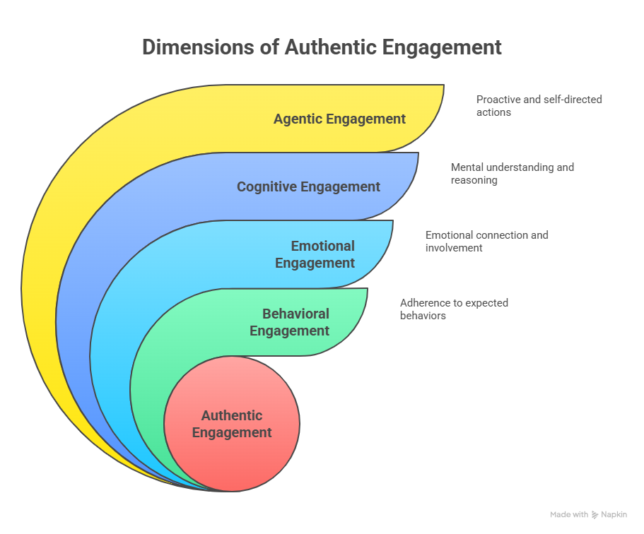 Therefore, I propose merging both models into a comprehensive continuum. Schlechty’s stages form the central engagement continuum. As the continuum approaches Authentic Engagement, elements of Kagan’s Behavioral and Emotional dimensions emerge. At Authentic Engagement, all four dimensions—Behavioral, Emotional, Cognitive, and Agentic—overlap and operate concurrently.